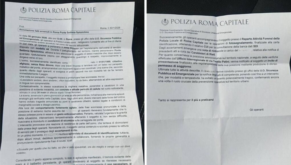 Una volta sul parapetto, scrivono gli agenti della Polizia Locale, l’uomo, senza fissa dimora, “iniziava a pronunciare frasi sconnesse, tra cui ‘Lasciatemi andare, devo andare’, ‘Non toccatemi, ho da fare’, alternandole ad altre espressioni in lingua non comprensibile”. E ancora: “Contestualmente, lo stesso scavalcava la ringhiera metallica, ponendosi a cavalcioni in una posizione di evidente instabilità, con concreto e attuale pericolo di caduta nel vuoto sottostante, stimato in circa 30 metri di altezza sopra i binari ferroviari. La scena, avvenuta in pieno giorno e in un’area ad alta percorrenza – si legge ancora nella relazione – richiamava alla memoria episodi analoghi già verificatisi nella Capitale, dove, negli ultimi anni, diversi interventi delle forze dell’ordine hanno evitato tragedie annunciate su ponti e cavalcavia cittadini, spesso legate a condizioni di marginalità sociale e disagio psichico”.