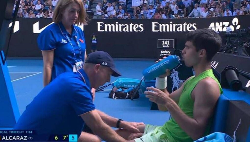 Il problema è iniziato dal polpaccio e si è esteso al quadricipite della gamba destra, con lo spagnolo che, al nono game del terzo set sul risultato di 4-4, si è preso qualche secondo in più al servizio per qualche esercizio di stretching, ma faticava a muoversi. Dopo aver tenuto la battuta, Alcaraz ha chiamato un medical time out per farsi trattare la coscia destra, con l’ingresso immediato del fisioterapista.