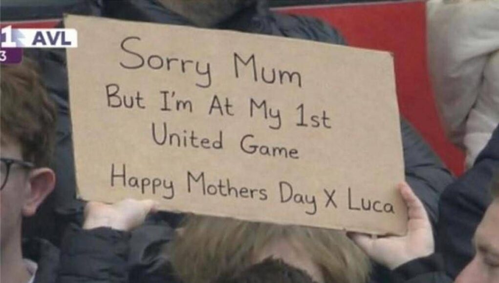 E così molti di loro hanno trascorso la festa della mamma allo stadio, ma trovando comunque il modo per dedicare un pensiero speciale. Un piccolo tifoso del Manchester United, in occasione del match contro l’Aston Villa, vinto dai Red Devils 3-1, ha esposto sugli spalti di Old Trafford un cartellone con scritto: “Scusa mamma, ma sono alla mia prima partita dello United. Buona festa della mamma! X Luca”.