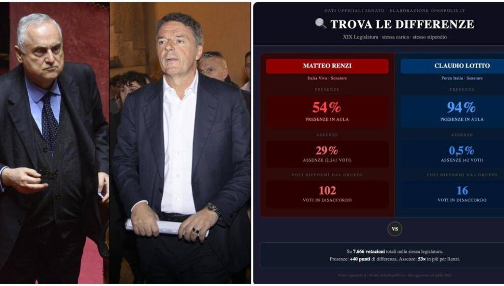 “I numeri -si legge in una nota diffusa dal patron della società biancoceleste- non si discutono. Si leggono. Stessa legislatura. Stessa carica. Stesso stipendio pagato dagli italiani. Poi ci sono i fatti: 54% di presenza per Matteo Renzi, 94% di presenza per Claudio Lotito. Su 7.666 votazioni, la differenza è netta: oltre 40 punti in più e assenze superiori di oltre 50 volte. Non è una sfumatura. È un divario! E non finisce qui: oltre 100 voti difformi dal proprio Gruppo” per Renzi “a conferma di una linea politica spesso variabile, non sempre coerente (in base agli interessi del momento). A questo punto la domanda è semplice: chi rappresenta davvero i cittadini in Parlamento?”.
