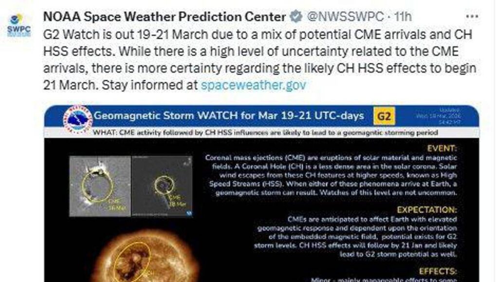 (Adnkronos) – Una tempesta geomagnetica di livello G2 (moderata) dovrebbe raggiungere la Terra tra oggi giovedì 19 marzo e sabato 21, in seguito a un’espulsione di massa coronale (CME – Coronal Mass Ejection) avvenuta il 16 marzo. A lanciare l’allerta la Noaa, l’agenzia americana che si occupa di monitorare e studiare l’atmosfera, il clima e gli oceani. Il fenomeno è dovuto alla combinazione di due fattori: il possibile arrivo sulla Terra di espulsioni di massa coronale (CME) e gli effetti di un flusso di vento solare ad alta velocità proveniente da un buco coronale (CH HSS).